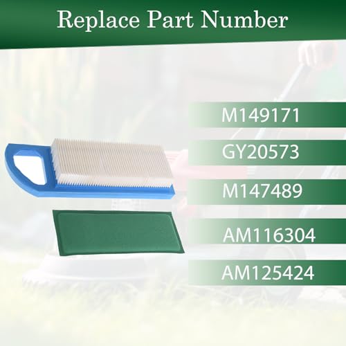 Package Listing: 1x Air Filter replaces M149171; 1x Pre Filter replaces GY20573, M147489; 1x Oil Filter replaces AM125424, GY20577, KH1205008; 1x Fuel Filter replaces AM116304, AM1163041, GY20709; 1x Spark Plug.